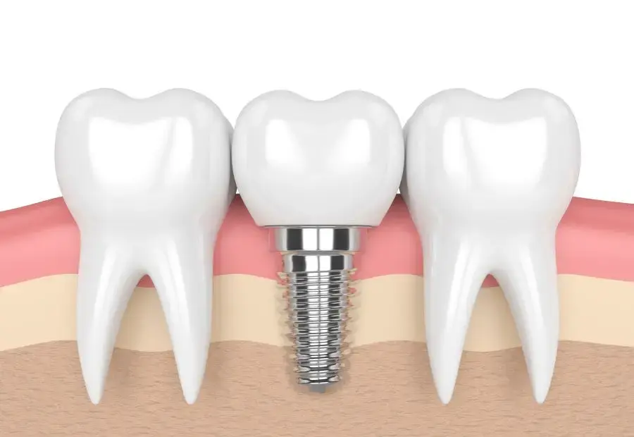 A dental implant is a small titanium post surgically placed into the jawbone to replace a missing tooth root.